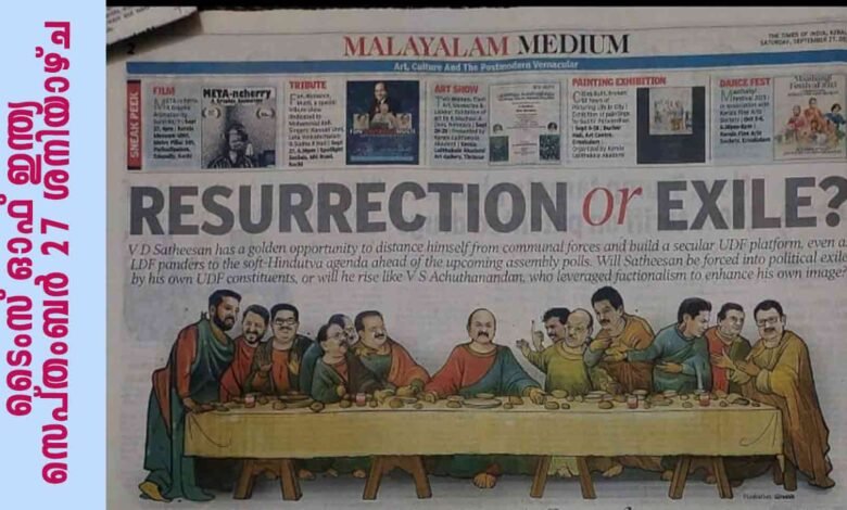 ക്രിസ്തുവിന്റെ അന്ത്യ അത്താഴ ചിത്രത്തിലെ യേശു ക്രിസ്തുവിന്റെയും ശിഷ്യന്മാരുടെയും സ്ഥാനത്ത് കേരളത്തിലെ രാഷ്ട്രീയ നേതാക്കളെ ഉൾപ്പെടുത്തികൊണ്ട്, ടൈംസ് ഓഫ് ഇന്ത്യയുടെ ശനിയാഴ്ചത്തെ (സെപ്തംബർ 27) മലയാളം മീഡിയം എന്ന പേജിൽ പുന:രുത്ഥാനം അല്ലെങ്കിൽ പ്രവാസം (Resurrection or exile) എന്ന തലക്കെട്ടോടെ പ്രസിദ്ധീകരിച്ച ചിത്രം കത്തോലിക്കാ വിശ്വാസികൾ ഏറെ വിശുദ്ധമായി കാണുന്ന ക്രിസ്തുവിന്റെ അന്ത്യ അത്താഴത്തോടുള്ള അവഹേളനമാണ് എന്ന് വളരെ വ്യസനത്തോടെ പറയട്ടെ.