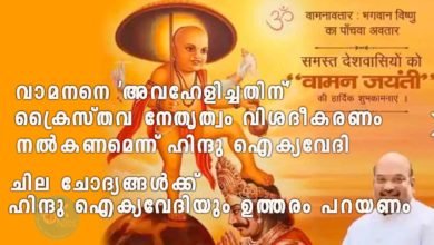 ഓണസന്ദേശത്തിലൂടെ വാമനനെ ‘അവഹേളിച്ചതിന്’ ക്രൈസ്തവ നേതൃത്വം വിശദീകരണം നൽകണമെന്ന് ഹിന്ദു ഐക്യവേദി; ഹിന്ദു ഐക്യവേദിയും ഉത്തരം പറയണം